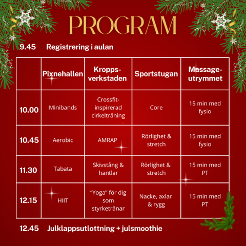Här hittar du alla träningspass som kommer att hållas under vårt träningsevenemang Julklappen som ordnas lördag 13.12.2025 kl.10:00-13:00. Eftersom vissa träningar har begränsat med platser ber vi dig anmäla intresse på förhand till de träningar som du vill delta i. Vi bekräftar per e-post eller sms vilka pass du har bokat och ryms med på.